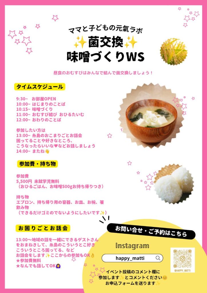 糸島で味噌づくりWSを開催します!「味噌作りは難しそう」「子どもと一緒にできるかな?」と思ったことはありませんか。私も5人の子育ての中で、忙しさや不安を抱えながら「ごはんで整う時間」にどれだけ助けられたかわかりません。そんな思いから、親子で楽しく参加できる味噌づくりワークショップを企画しました。